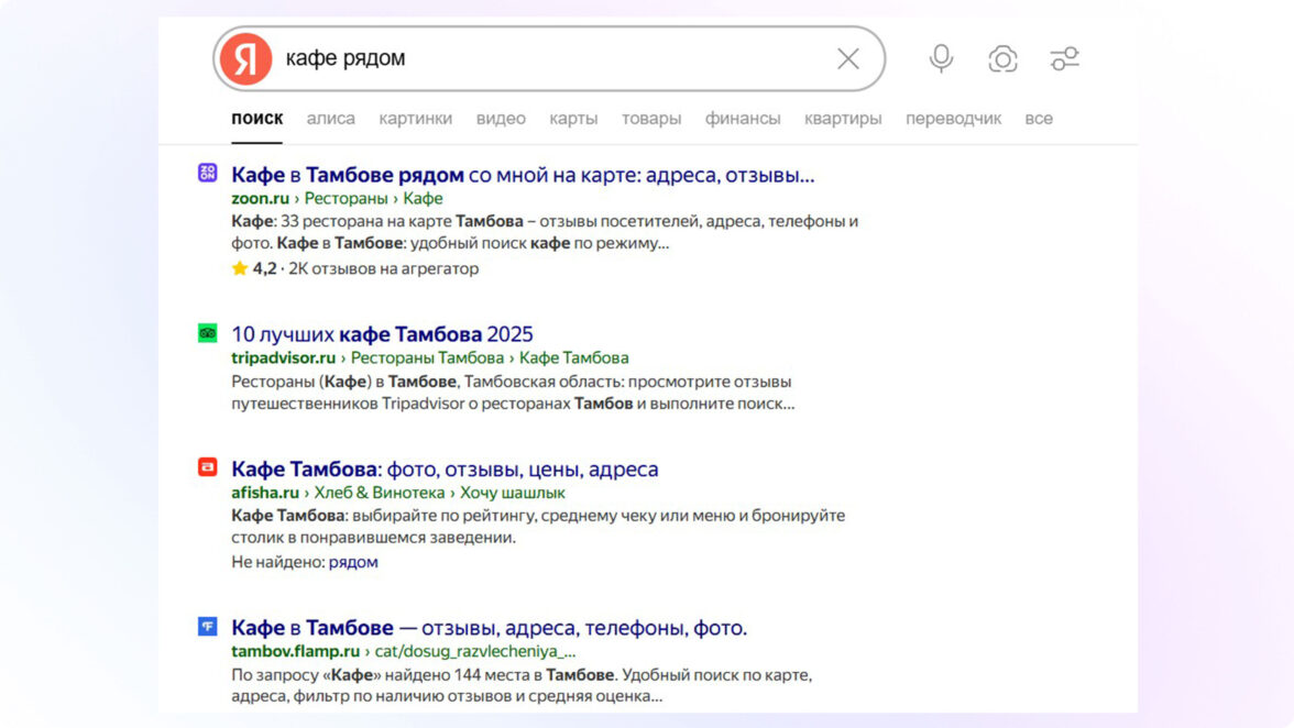 Видимость в локальном поиске. По запросам вроде «кафе рядом», «ремонт квартир Воронеж», «клиника Екатеринбург» поисковики в первую очередь показывают площадки с отзывами. Если вас там нет — вы не попадете в ТОП-выдачи, даже если оказываете качественные услуги.