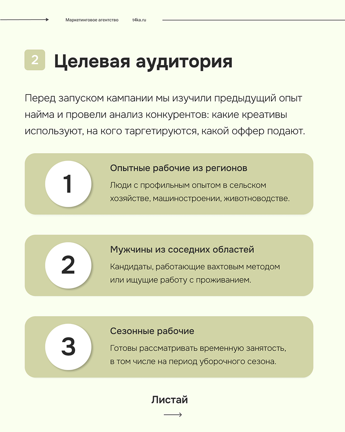 Перед запуском кампании мы изучили предыдущий опыт найма и провели анализ конкурентов: какие креативы используют, на кого таргетируются, какой оффер подают.