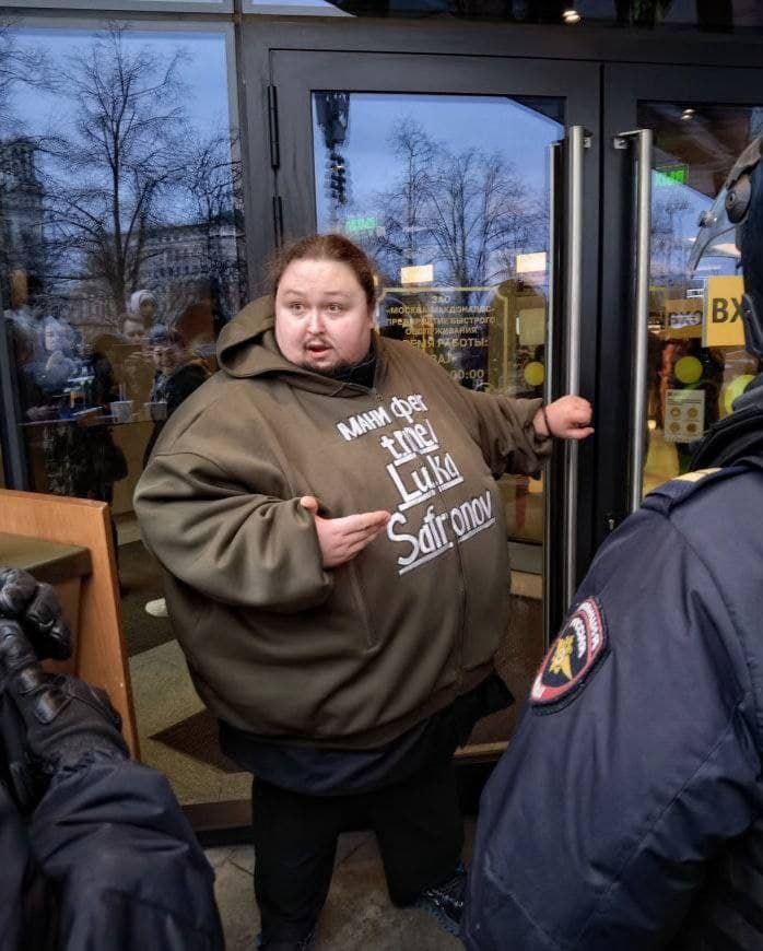 Не обошлось и без перформансов. Лука Затравкин, 32-летний сын известного российского художника Никаса Сафронова, в знак протеста против ухода компании из России приковал себя наручниками к дверям заведения на Пушкинской.