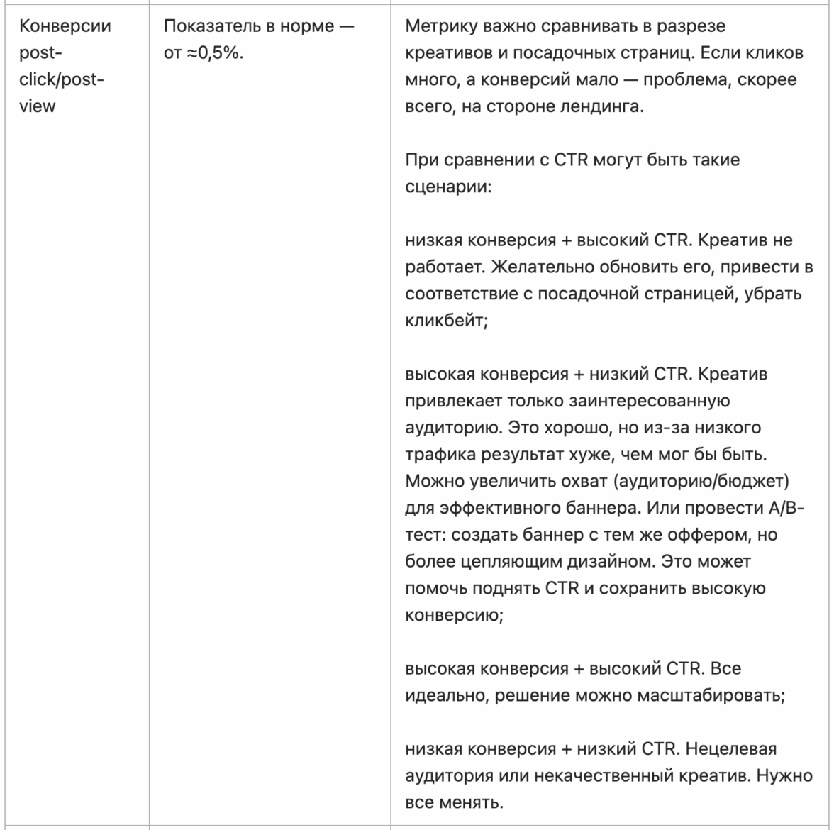 Post-click и post-view-конверсии — общее число целевых действий (покупок, заявок, регистраций), совершенных после клика или просмотра рекламы. Данные стоит анализировать по площадкам, датам и креативам, чтобы выявлять устойчивые закономерности.