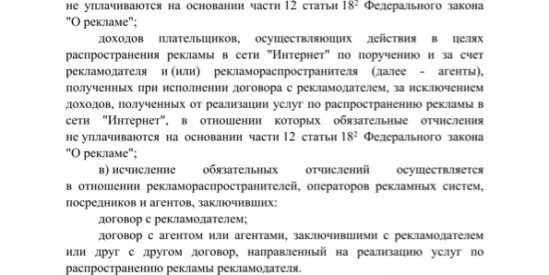 В отдельную категорию авторы поправок выделили российских рекламодателей, которые размещают у зарубежных рекламораспространителей рекламу для россиян. В документе сказано, что если рекламодатель сотрудничает с иностранными рекламораспространителями, он обязан самостоятельно рассчитать и удержать сбор из вознаграждения такого иностранного лица, чтобы затем оплатить эти средства в бюджет.