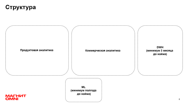 Итак, теперь мы готовы переходить к найму — и делать это надо быстро. Скоро придут заказчики, сроки по задачам будут гореть. Мы уже собрали большую команду из data-инженеров, системных аналитиков,data/продуктовых аналитиков, ML-инженеров. Поделюсь алгоритмом удачного найма и несколькими лайфхаками.