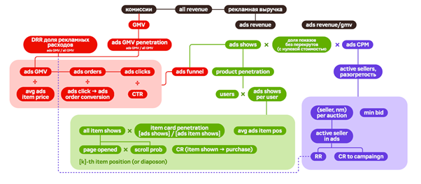 А так выглядит полное дерево метрик. Оно разделяется на два направления: работа с поставщиками (retention, привлечение новичков, средний чек рекламодателя, CPM) и работа с пользователями (продуктовая воронка, перекруты).