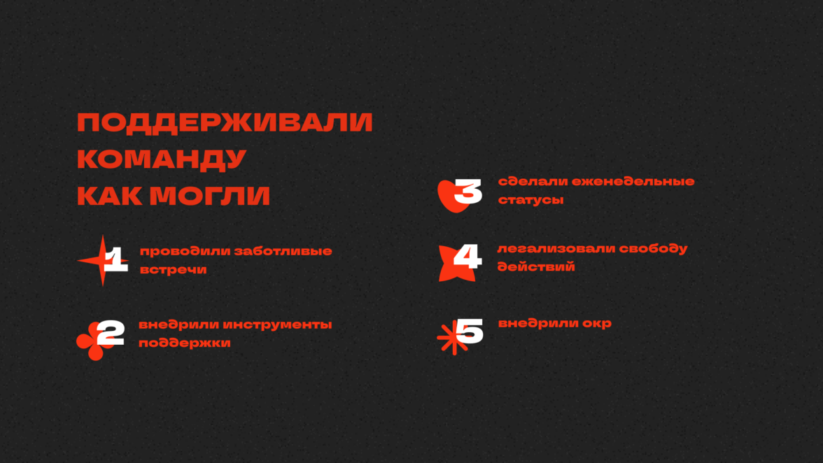 Забюрократизировались и зажирели. Мы выстроили много процессов, но некоторые оказались довольно сложными и ненужными в рамках новой реальности бизнеса, где мы должны были снова превратиться в стартап и принимать решения без лишних проволочек. Продажи, подготовка предложений, производство контента, обучение людей — все эти механизмы помогли нам не паниковать и просто делать своё дело. В то же время пришлось вспоминать, как в «ручном режиме» управлять некоторыми проектами, более трепетно относиться к финансовой системе и ещё чаще общаться с людьми, чтобы просто поддержать их.