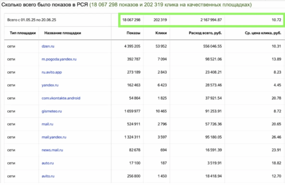Из аналитики от 20.06: «за 1,5 месяца 18000000 показов и200000 переходов на сайт в РСЯ на качественных площадках (dzen, pogoda,avito, vk). Из них в авито 536457 показов и 4336 кликов, а Вконтакте69546 показов и 2244 кликов.»