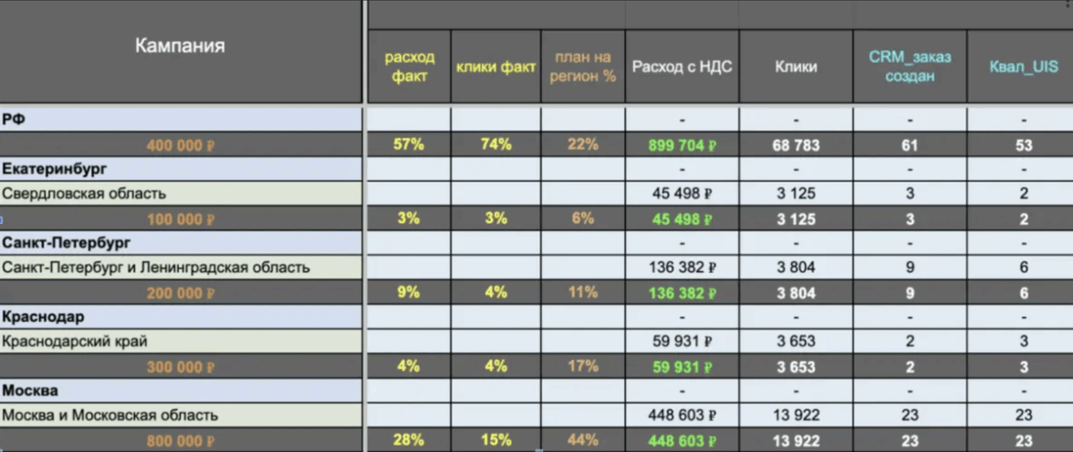 Был создан кастомный дашборд на основе Гугл-таблиц. Суть в том, что нельзя просто взять и разделить рекламные кампании по регионам: сломается обучение. Поэтому у нас были основные доходогенерящие РК по всей России, но мы все равно видели реальные расход/доход по нужным нам регионам, ставили себе план и контролировали его выполнение. Если мы понимали, что какой-то регион отстает, то уже создавали дополнительные кампании на усиление.