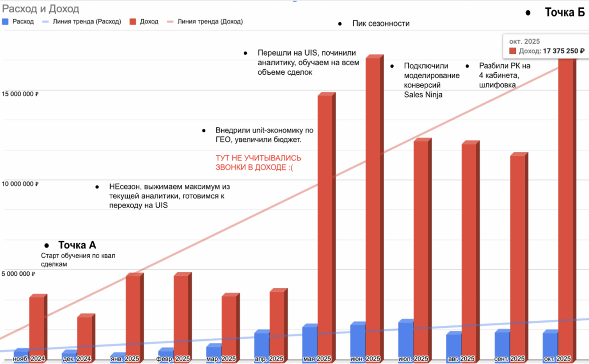 Сейчас по проекту идеально отстроенная сквозная аналитика на базеUIS, которая учитывает все каналы продаж в разбивке по расходу (включая затраты на подрядчиков), доходу и воронке продаж с 4-мя этапами.