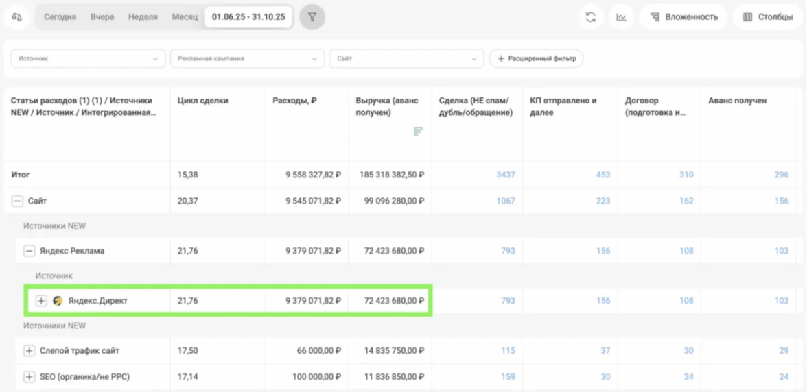 Можно смело говорить, что аналитика по рекламе из Директа работает идеально с июня 2025, но была проблема с распределением сделок по другим каналам. С помощью создания кастомных источников и вложенностей в UIS мы добились, что слепая зона (когда продажи падают в поле «Без источника») уменьшилась с 77% до 30%. На таких объемах данных в сквозной аналитике такая погрешность считается «золотым уровнем», поскольку всегда будет: