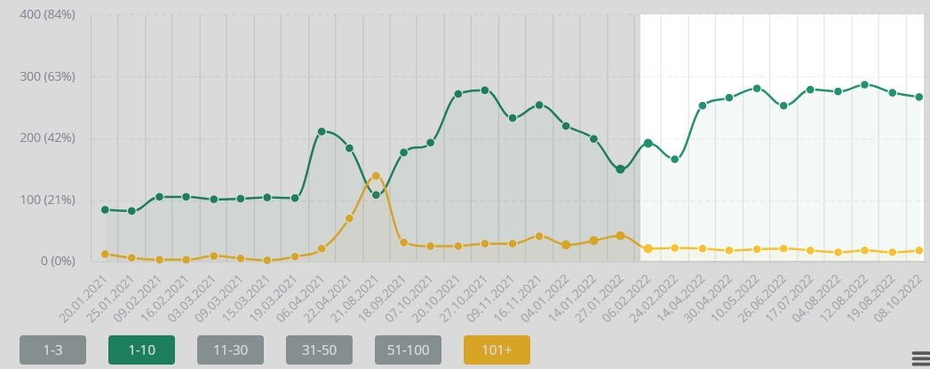 Но важнее не это, а то, что впервые для этого сайта удалось зафиксировать позиции на достигнутом. Методичная аналитичная работа над сайтом позволяет нам удерживать позиции по ВЧ и СЧ-ключам.