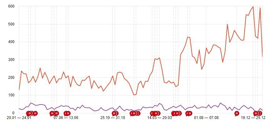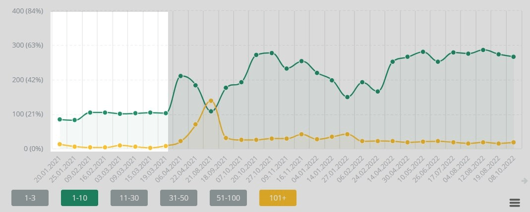 Из семантики пришлось вычистить кучу «нулевых» запросов, добавленных туда предыдущими подрядчиками ради красивой статистики. Но мы изначально обговорили с заказчиком, что наша цель — не статистика, а реальная видимость сайта, рост трафика и лидов с сайта. Даже не смотря на это, позиции сайта на графике выше, чем даже на пиках предыдущих накруток.