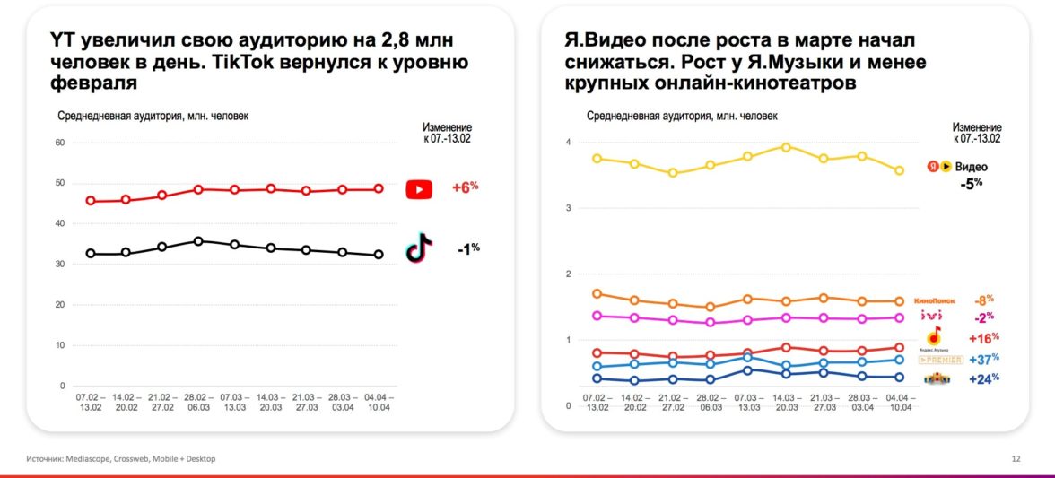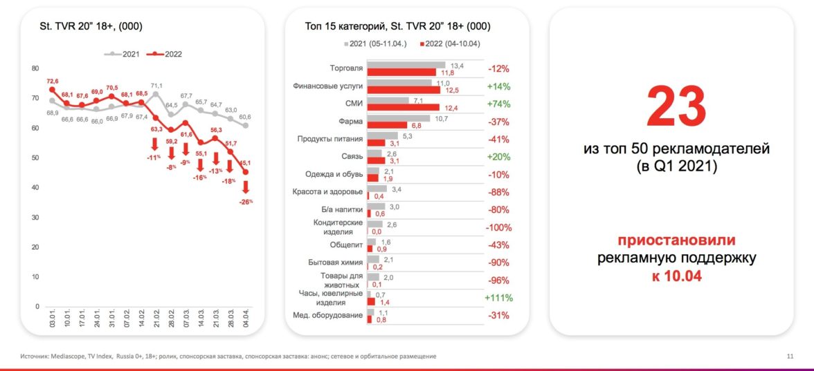 Падение рекламного инвентаря достигло -26%. Некоторые категории, прежде значительные по объемам, почти полностью отсутствую на ТВ (кондитерские изделия, бытовая химия, товары для животных). Всего 23 компании из топ 50 прекратили размещение на ТВ. Россия 1 удерживает уверенное лидерство по доле с конца февраля.