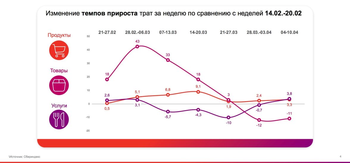 С 04 по 10.04 траты сохраняются ниже январских показателей. По данным Ромир, резкое падение покупок наблюдается в сегменте значительно подорожавших импортных товаров. Начало режима экономии видно и по FMCG, где наиболее значительное падение у подорожавших импортных товаров.