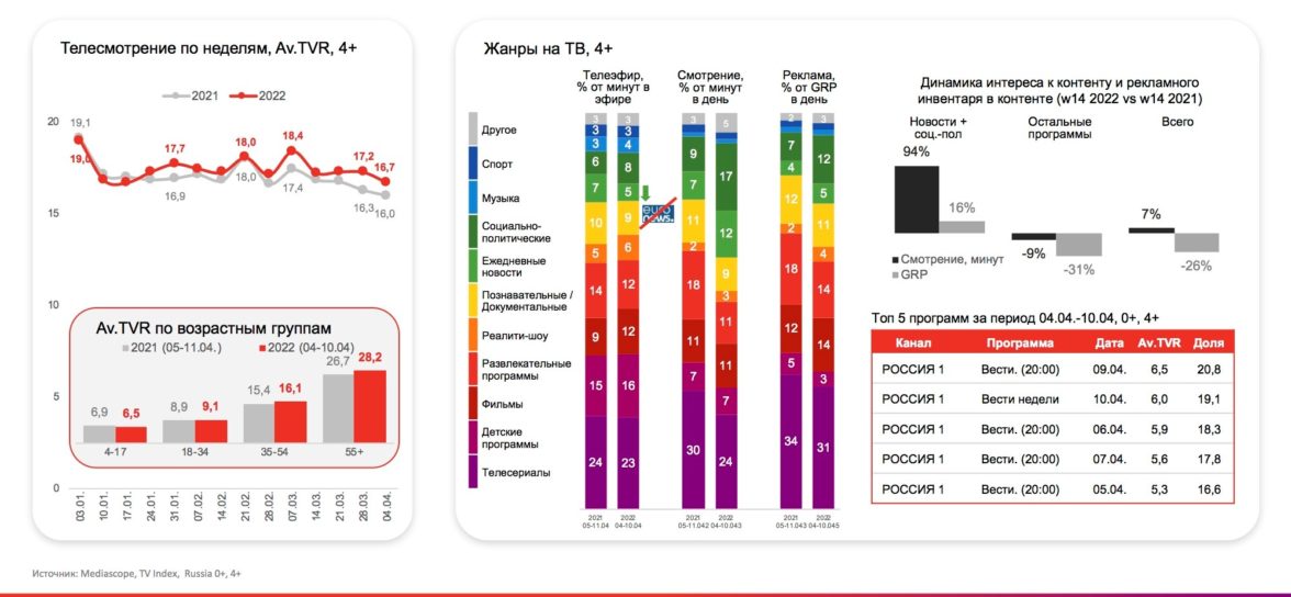 Телесмотрение продолжает оставаться выше прошлогодних значений во всех группах старше 18 лет. Сохраняющийся двукратный рост интереса к новостям обеспечивает рост рекламного инвентаря в этом жанре на фоне общего падения объемов рекламы.
