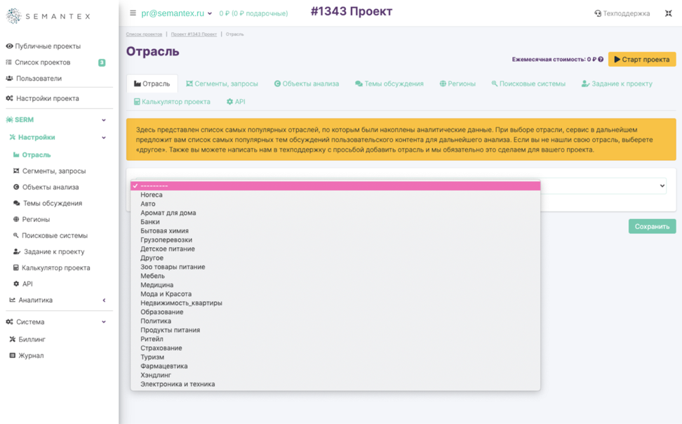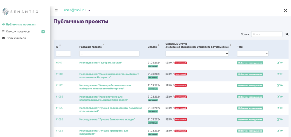 Каждый месяц команда Semantex выпускает публичные проекты по разным темам и направлениям бизнеса.И делится свежей аналитикой со всеми желающими. Доступ к публичным проектам есть у всех зарегистрированных и незарегистрированных пользователей. В рамках публичного проекта можно ознакомиться не только с аналитикой, но и с настройками проекта. Подраздел «Аналитика» есть в разделе каждого сервиса и доступен в левом меню у каждого проекта.