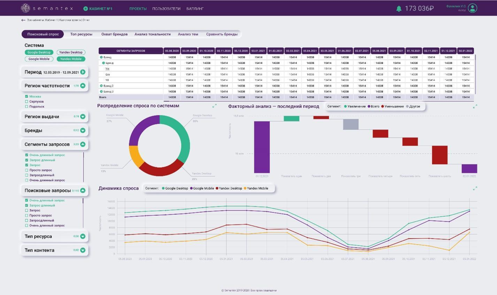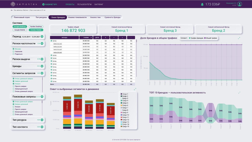 Semantex.SERM — инструмент для управления репутацией в интернете, который предоставляет возможность взглянуть на бренд глазами потенциальных клиентов. С его помощью можно оценить, как бренд воспринимается потребителями не только в поисковой выдаче в сравнении с конкурентами, но и в целом в заданном сегменте рынка. В этой статье мы расскажем, какие задачи позволяет решать сервис, и как новому пользователю разобраться во всех, казалось бы, сложных графиках и схемах аналитических отчетов.