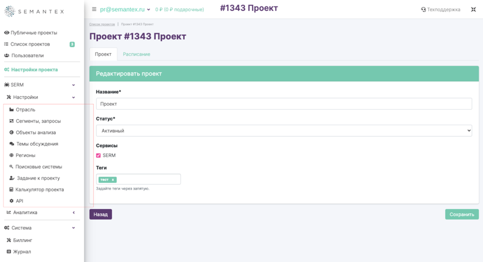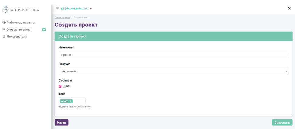 Чтобы создать свой проект, необходимо перейти в раздел «Список проектов» в левой части экрана. В появившемся окне выбрать «Создать проект». Далее у вас появится возможность дать название, определить статус проекта (активный или остановленный), выбрать сервисы и проставить собственные теги.