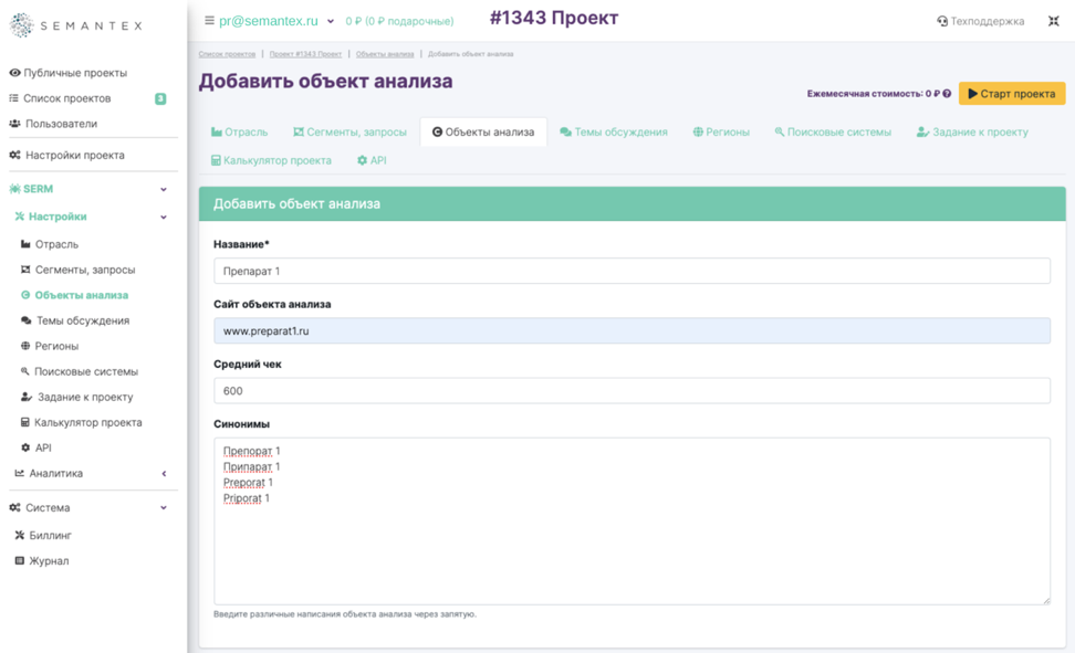 Следующий шаг — создать объекты анализа. Объект анализа в контексте настроек проекта — может быть бренд, может быть категория бренда, HR-бренд и др. Например, объектом может быть какой-то конкретный банк, а может — кредитная карта этого банка или любой другой продукт для клиентов, который необходимо проанализировать. При добавлении объекта анализа нам необходимо указать его название, официальный сайт или любая ссылка с описанием объекта, средний чек (участвует в расчете репутационных рисков в разделе аналитики) и синонимы — варианты написания (здесь можно привести варианты написания с ошибками, на других языках, в сокращенном виде или производных часто используемых формах и так далее). Чем детальнее будут прописаны синонимы объектов, тем точнее будут идентифицированы их упоминания на каждом URL. Также в разделе «Объекты анализа» есть опция импорта из формата CSV-файла с колонками, расположенными в любой последовательности.