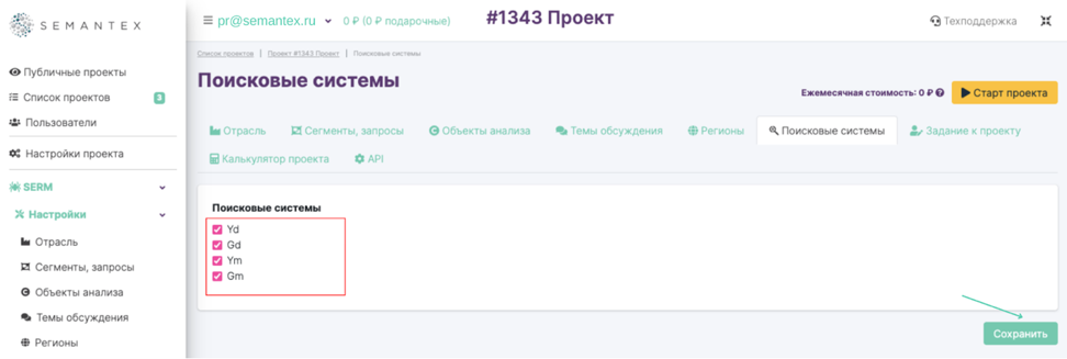 Далее перейдем к разделу «Поисковые системы». По умолчанию в вашем проекте стоят настройки для анализа систем: Яндекс Desktop, Google Desktop, Яндекс в мобильной версии и Google в мобильной версии. Но вы можете установить галочки напротив тех систем, которые интересны именно в рамках вашего проекта.