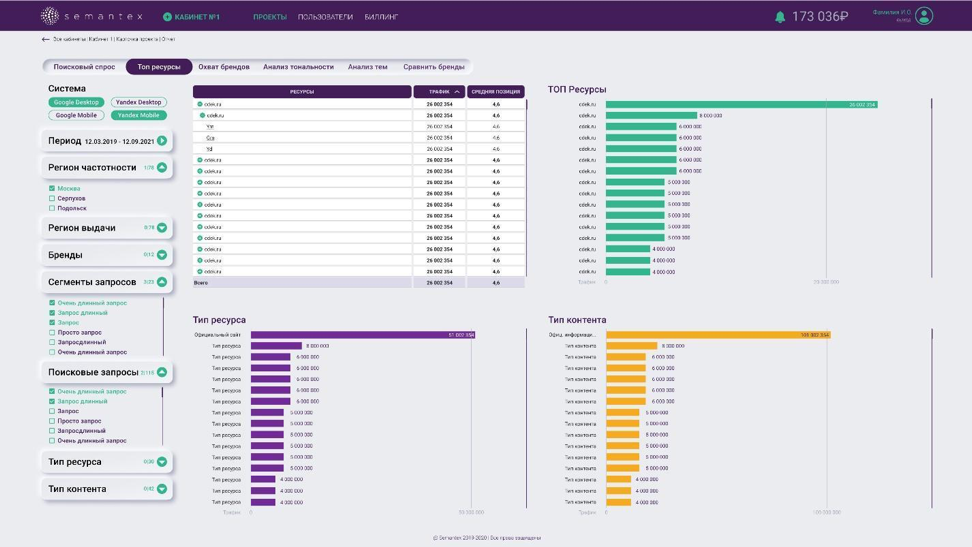 Эта часть аналитики помогает понять, какие ресурсы занимают самые высокие позиции в ТОПе поисковых систем, какой объем трафика приходится на эти ресурсы, и на какой тип контента чаще всего обращают внимание пользователи при поиске информации.