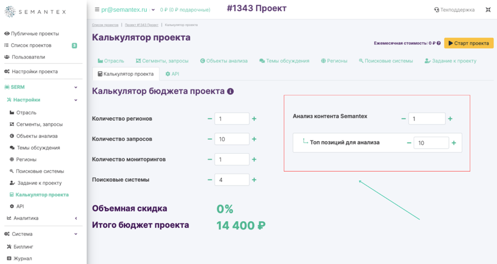 «Калькулятор проекта» — раздел виджетов, с помощью которых можно на основе заданных вами настроек заранее рассчитать бюджет проекта. Обратите внимание, нужен ли вам «Анализ контента Semantex», или в рамках вашего проекта необходимо посмотреть только поисковую выдачу. Если анализ нужен, то укажите это в параметрах.