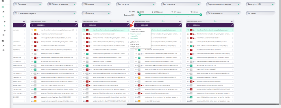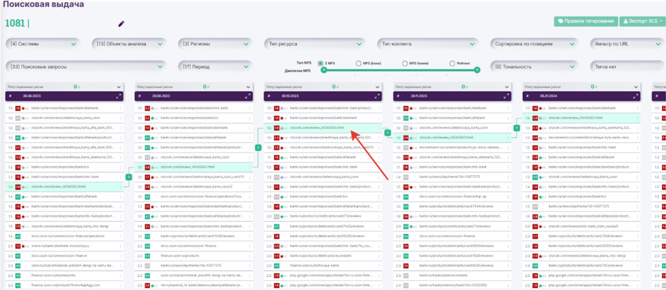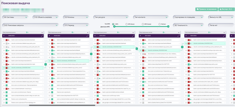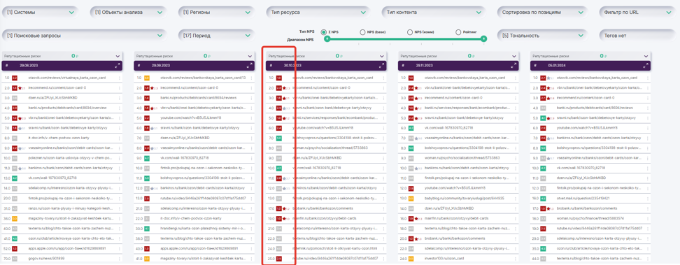 Напротив каждого URL указаны значения позиций сайта в ТОПе поисковой системы, оценка NPS (тональность), оценки рейтингов ресурсов при наличии.