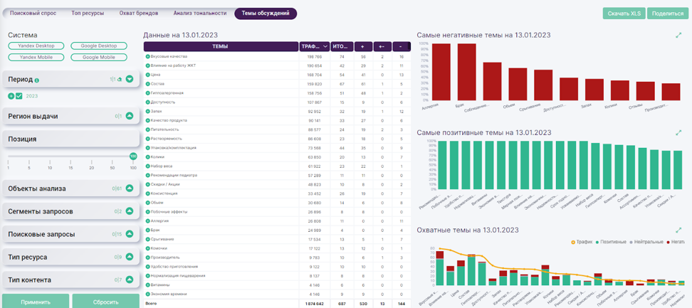 Количество позитивных, негативных и нейтральных комментариев в абсолютных и относительных значениях, которые видят пользователи на ресурсах поисковой выдачи. Оценки тональности принадлежат заданным объектам анализа.