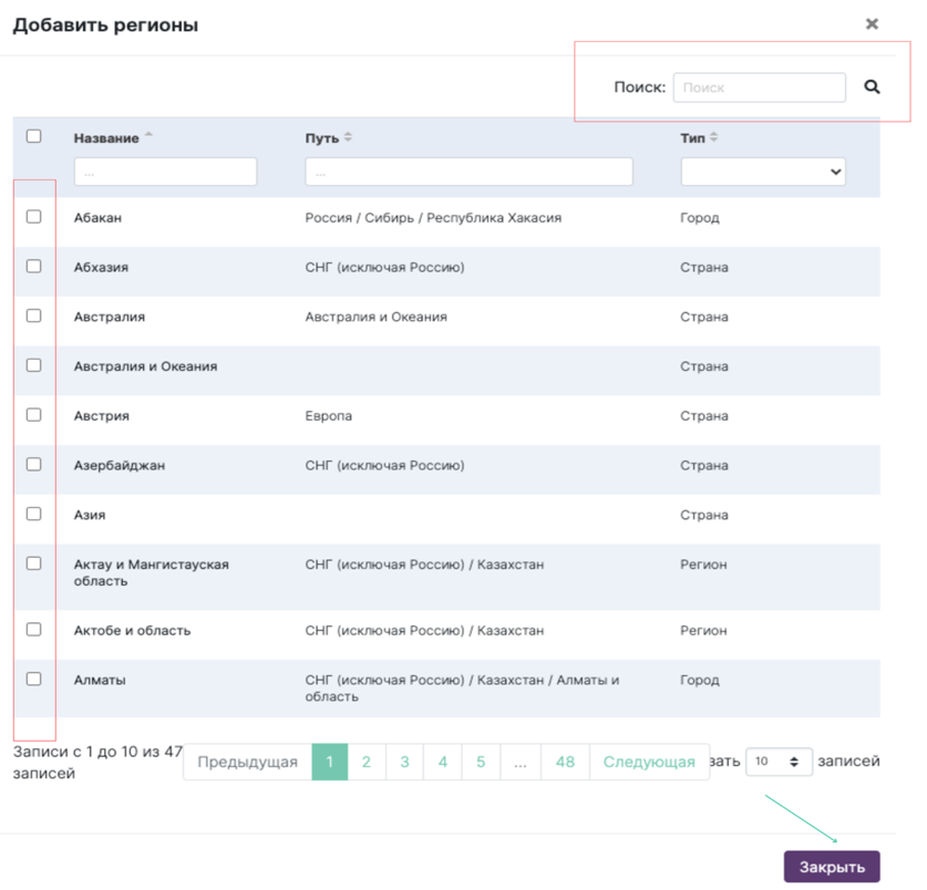 Следующий важный раздел — «Регионы». Для добавления параметров по регионам нажмите «Добавить регионы». Для добавления регионов нажимаем галочку слева от выбранной области. Найти нужный регион можно с помощью инструмента «Поиск».