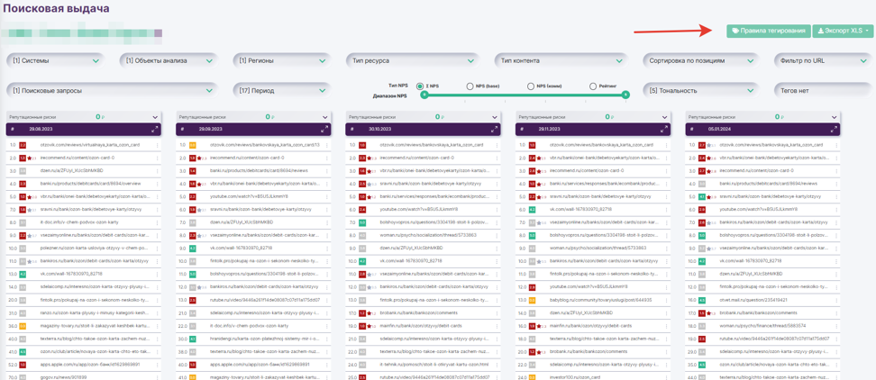 В данном разделе представлена выдача URL по всем заданным поисковым системам. Список URL по умолчанию представлен в виде ТОПа позиций от 1 до 100. С помощью фильтра можно отсортировать выдачу по параметрам: поисковые системы, поисковые запросы, объекты анализа, регионы, период мониторингов, тип ресурса и тип контента, тональность URL, позиция или трафик, теги, по параметрам оценок NPS. Также можно найти любой URL выдачи через поисковую строку.