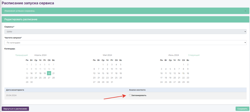 Расписание запуска мониторингов можно создать сразу или после внесения всех параметров в настройках сервиса. В открывшемся окне выбираем сервис, по которому необходимо создать расписание, и задаем частоту запуска мониторинга: ежемесячно, еженедельно, ежедневно, каждый час или по календарю. Здесь же есть дополнительное поле для планирования «Анализа контента».