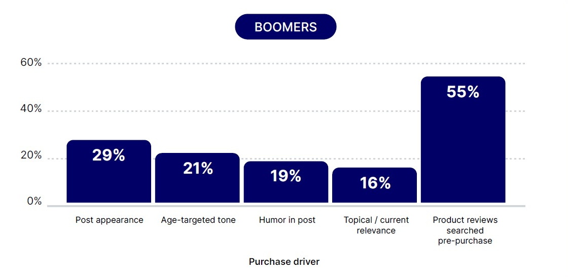 При этом важность постов с обзорами товаров зависит от возраста участников исследования. Интересное и подробное описание при выборе продукта важно для 35% зумеров (это минимум) и 55% бумеров (максимум).