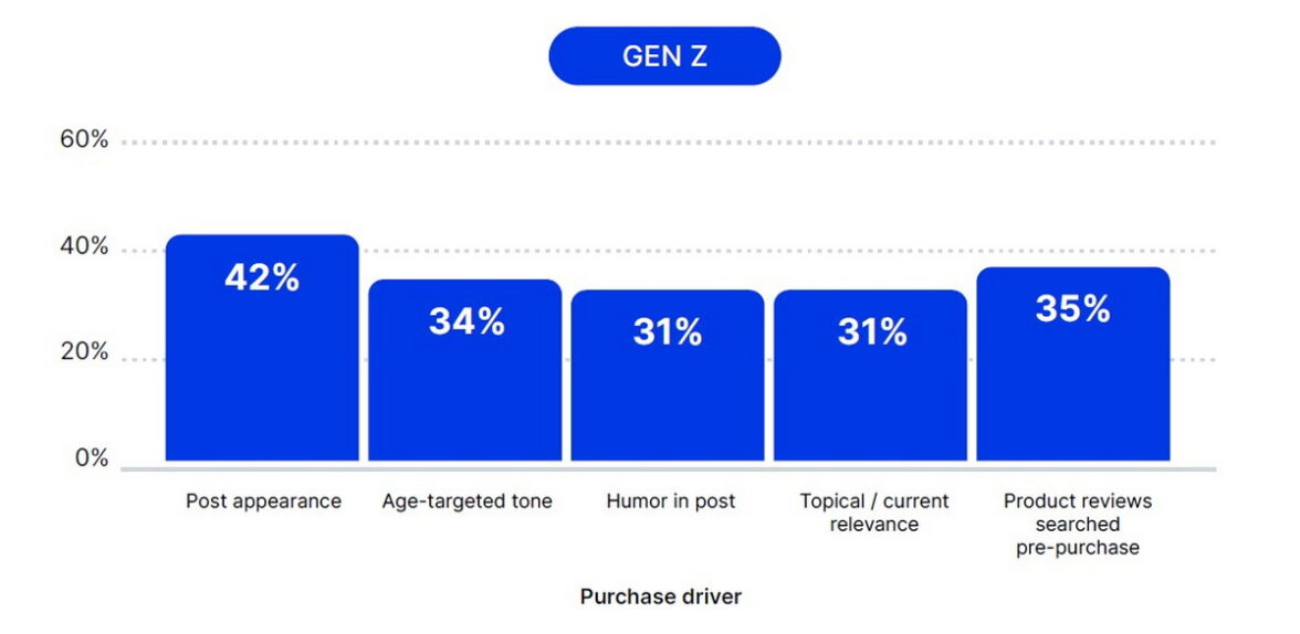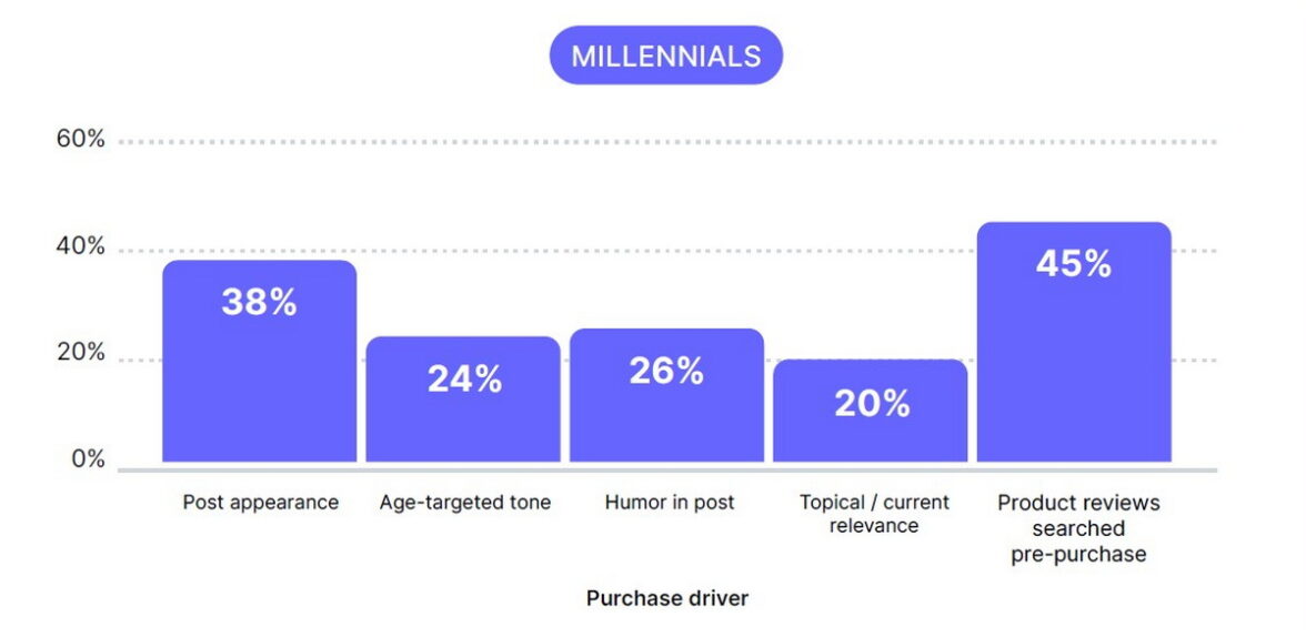 Согласно исследованию, 42% представителей поколения Z и 38% представителей поколения Y (миллениалов) при принятии решения о покупке ориентируются на красочное оформление поста. Среди представителей поколения бумеров такое мнение разделяют лишь 29%. Вторым по важности для зумеров стала манера сообщения бренда: 34% из них предпочитают, чтобы с ними разговаривали на принятом в их среде языке. Для сравнения, тон сообщения привлекает 24% миллениалов, 23% иксов и 21% бумеров.