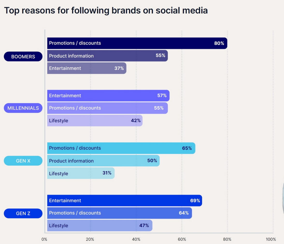 Что касается конкретных предпочтений разных возрастных групп. С бумерами все просто: им прежде всего нужны выгодные предложения: 80% из них ждут скидок и подарков, информация о товарах (55%) и уже потом развлечения (37%). А вот поколение Z приходит на страницу бренда как раз с целью отдохнуть и развлечься: именно так ответили 69% респондентов. Выгодные предложения интересуют зумеров во вторую очередь (64%), третье, чем можно заинтересовать людей в возрасте от 18 до 24 лет — лайфстайл-контент.
