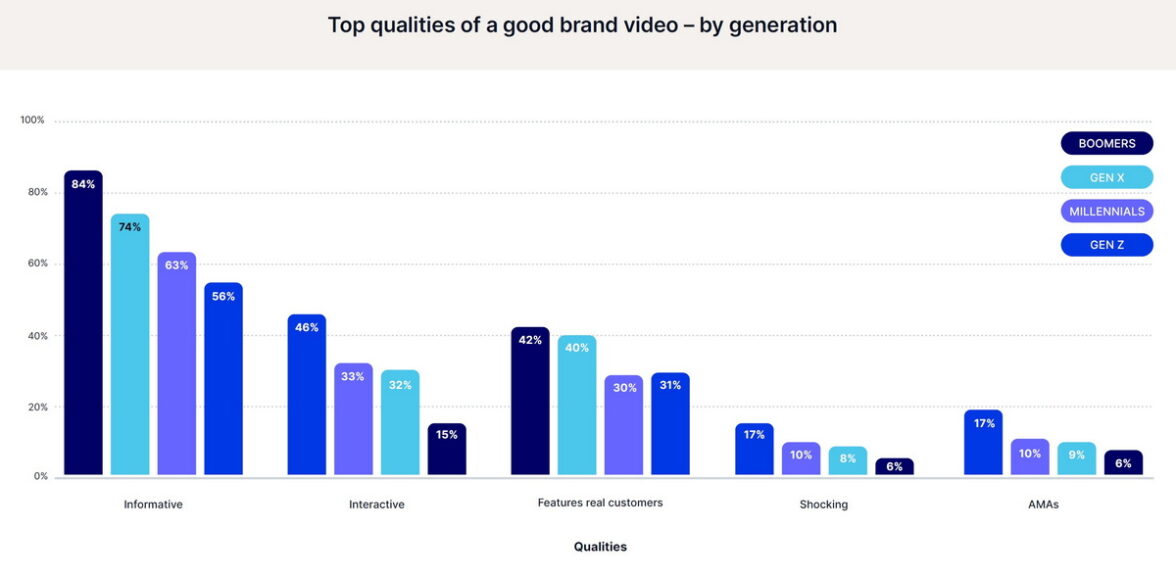 Фолловеры больше всего ценят в видео брендов информативность. Так считают 84% опрошенных беби-бумеров, 74% иксов, 63% миллениалов и 56% зумеров. При этом в исследование Emplifi отмечается, что молодые поколения предпочитают интерактивные и вовлекающие форматы. Например, почти половина представителей поколения Z (46%) говорят, что интерактивность выделяет брендовое видео. Для бумеров этот показатель не превышает 15%.