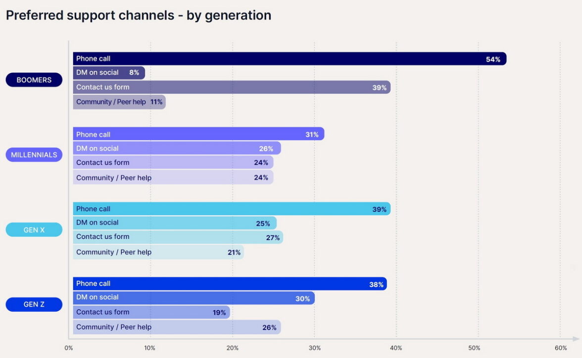 Если же говорить о каналах общения с клиентской поддержкой в целом, то безусловным лидером для всех поколений остается телефон. Вербально получать нужную информацию от брендов хотят 54% бумеров, 38% иксов и зумеров и 31% миллениалов. Что касается других линий общения, то зумеры и миллениалы отдали второе место (30% и 26% респондентов соответственно) общению через соцсети, а иксы и бумеры (27% и 39%) — формам обратной связи на сайтах.