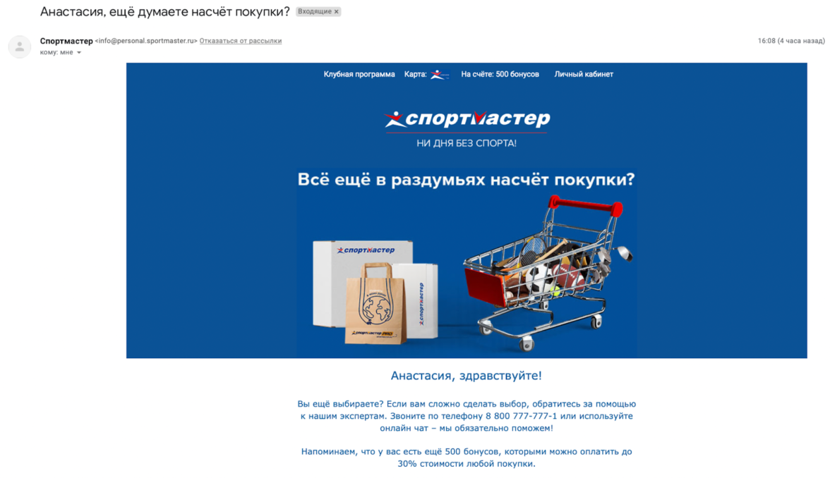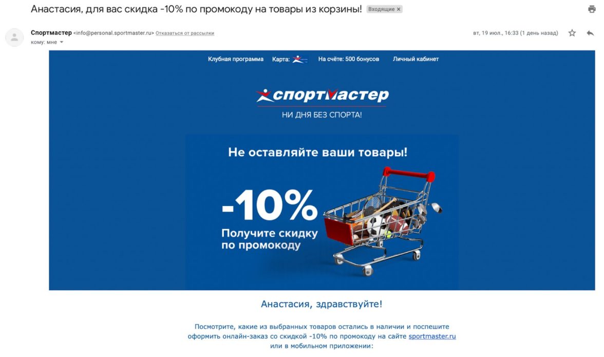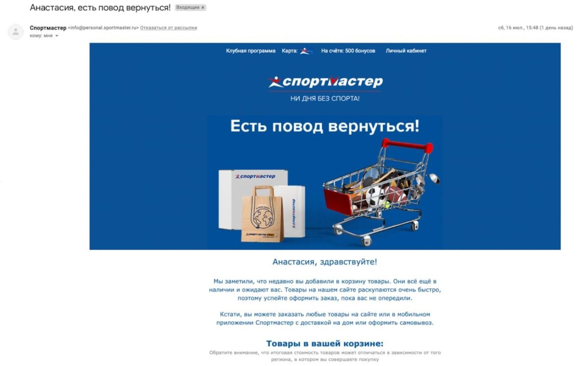 На одном письме-напоминании магазин не заканчивает рассылку. Он присылает второе, где пользователю задают вопрос о покупке, предлагают помощь с выбором. Ещё пишут о бонусных баллах, которые пригодятся, если корзину оставили именно из-за стоимости покупок.