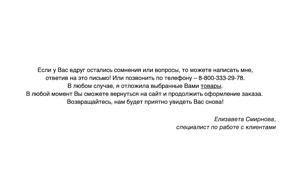 Автоматическая email-рассылка напоминает клиенту о покупке. В письмах компании часто используют триггер упущенной выгоды и говорят, что товар скоро закончится. Но можно действовать по-другому: предложить помощь с выбором (даже от лица конкретного менеджера), напомнить о рассрочке и бонусах, удобную доставку и широкий ассортимент. Самое главное — общаться человеческим дружелюбным языком. Также используйте интригу или юмор, чтобы привлечь внимание, тогда письмо точно откроют.