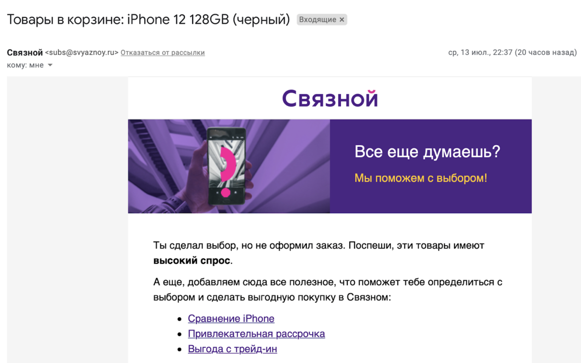Если причина в «забывчивости», покупку спасёт письмо напоминание. Для уведомлений о незаконченной покупке также используют Push и ретаргетинг.
