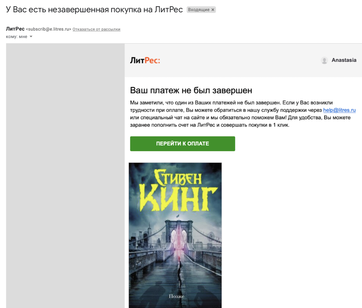 Книжный магазин, возможно, знает основную причину брошенных корзин, поэтому в письме говорит об оплате. Акцент не на завершение заказа, а на транзакцию. Здесь же предложение помощи, если с платежом случились трудности.