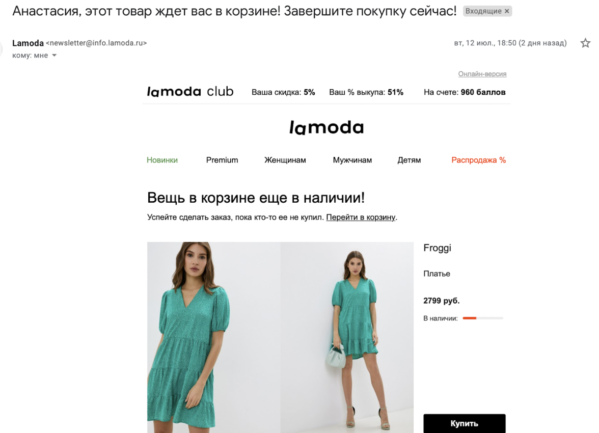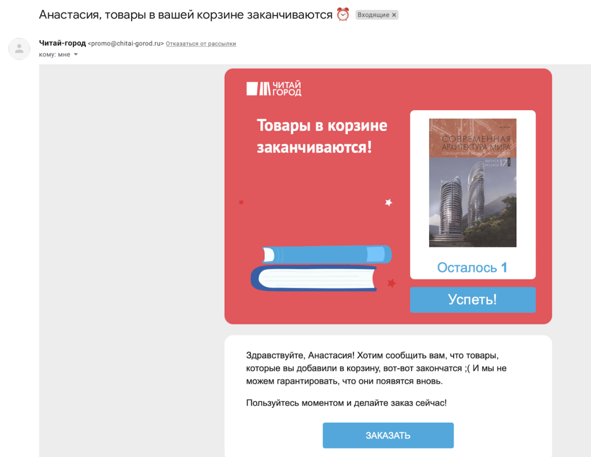 Эта триггерная рассылка аккуратно намекает пользователю, что товар может закончиться. Письмо от бренда сообщает, что «товар ещё в наличии» и нужно завершить заказ, «пока кто-то не купил». Здесь должен сработать страх клиента упустить выгоду.