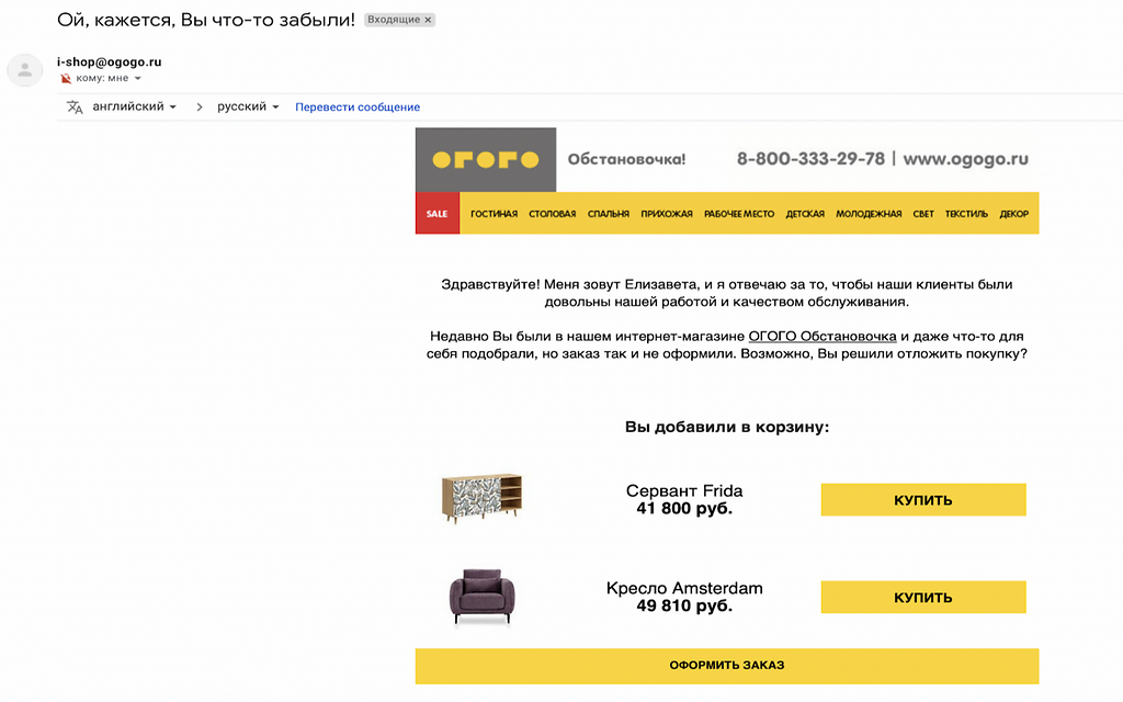 Магазин мебели и аксессуаров «очеловечивает» письмо, которое приходит от лица менеджера. Сотрудник лично предлагает помочь с выбором — это подкупает пользователя.