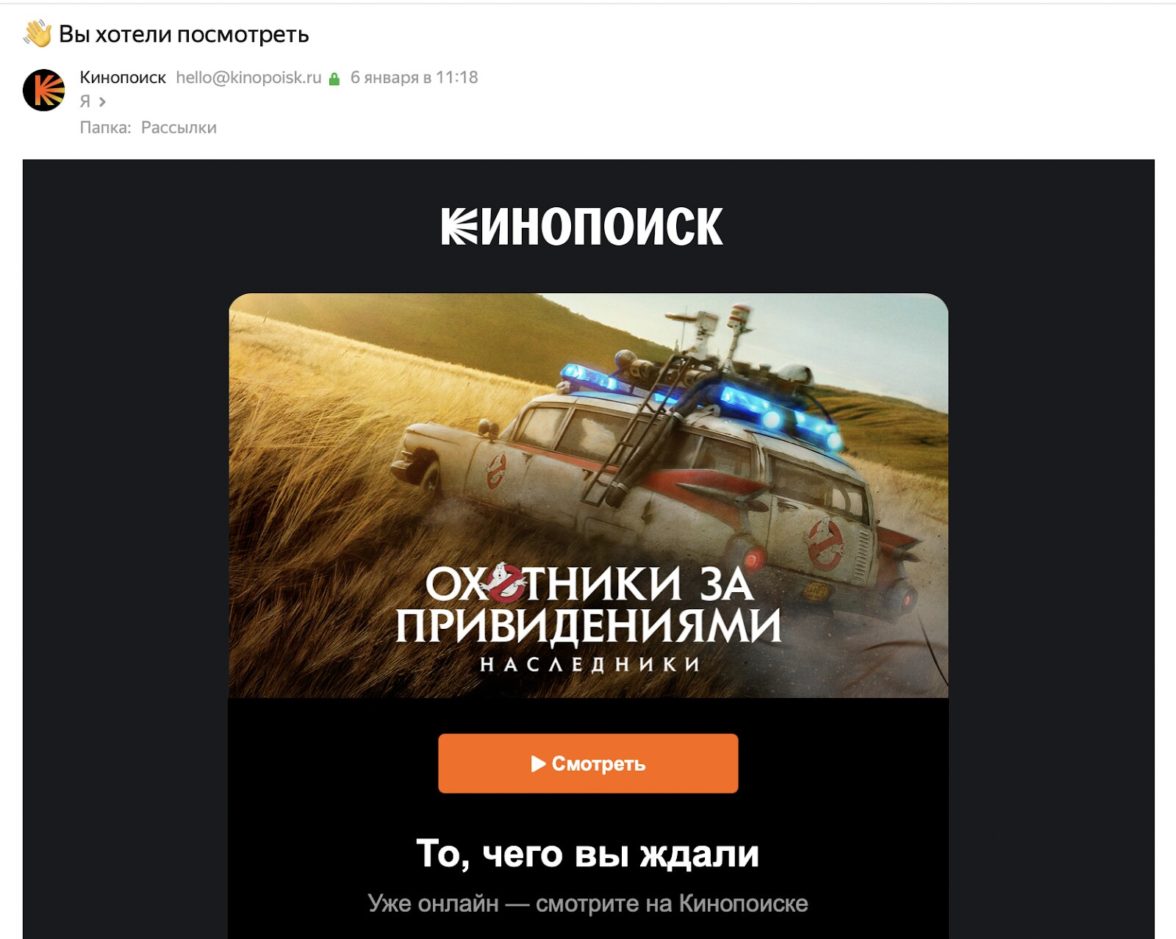 Брошенной бывает не только корзина в магазине. Сервис для просмотра кино также напоминает о незавершённых заказах. Так пользователь когда-то добавлял в избранное фильм из платного каталога, но не оплатил. Сервис отправляет письмо, в котором предлагает всё же посмотреть фильм.