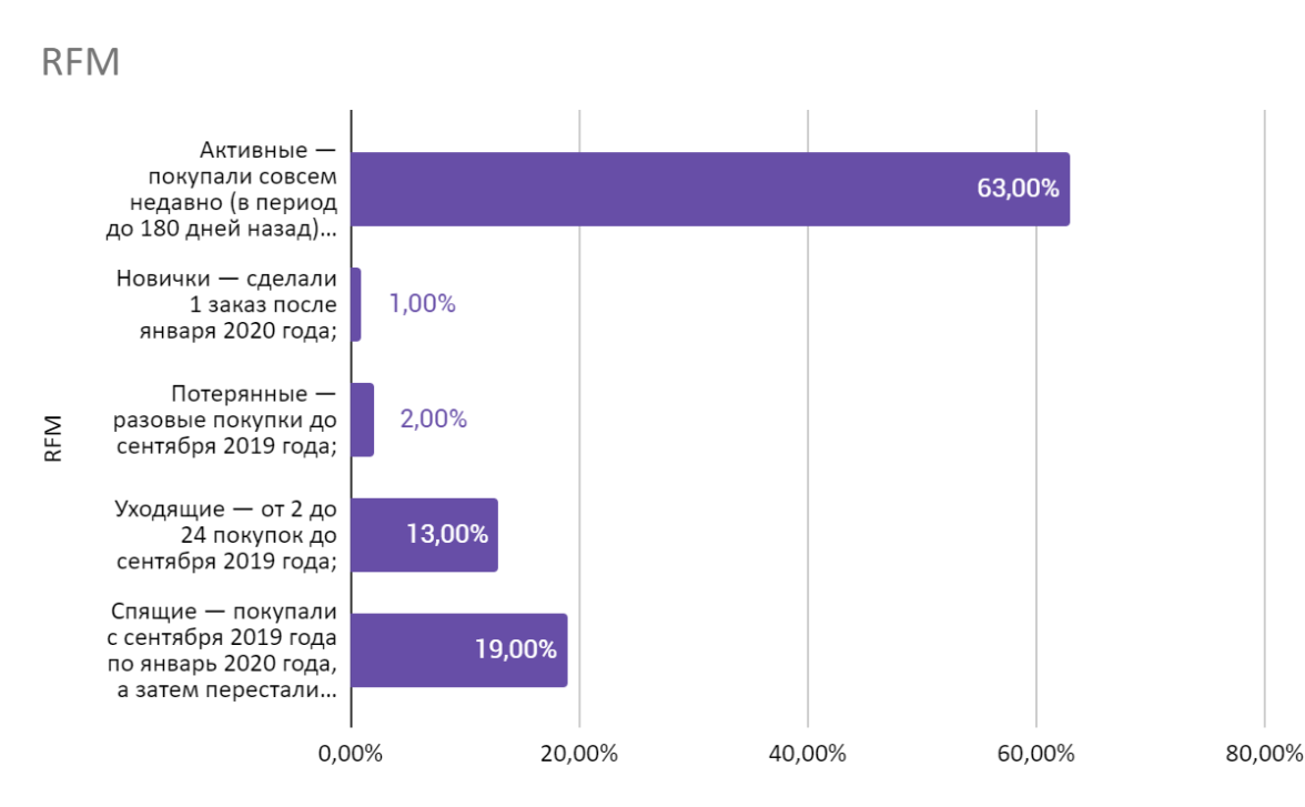 Так, 63% базы покупателей составляют покупатели, совершившие покупки в период от 1 до 180 дней. Потерянные, уходящие и спящие клиенты составляют 34% всей базы. Мы попробуем реактивировать их и мотивировать на новые покупки. Новичков нужно привлекать и превращать в активных покупателей, а активных удерживать на прежнем уровне и повышать их средний чек.