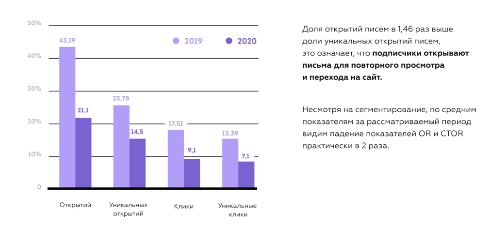 Показатели открытий и кликов снижаются от года к году. Бренд отправлял однотипную информацию — об акциях и бонусных баллах подписчика. Скорее всего, люди устали от акций, и чтобы вовлечь их в коммуникацию, необходимо включать новые форматы рассылок, например, контентные.