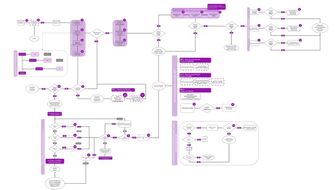 Все коммуникации с клиентами из разных сегментов складываются в единую карту коммуникаций. Цепочки, структура, очередность, логика — все это отображается в карте.