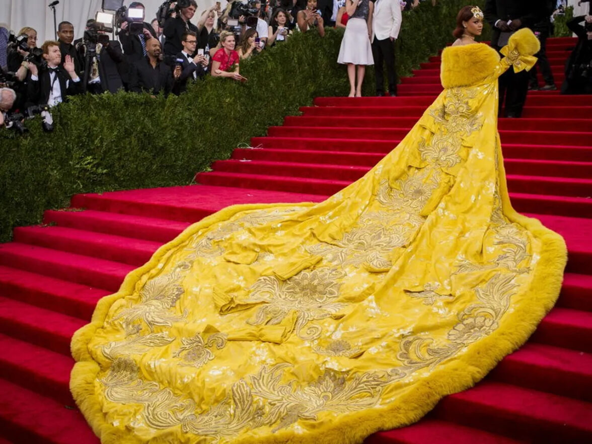 Рианна в 2015 году в платье от Guo Pei — этот выход стал настоящим символом Met Gala. Образ Рианны, который вызвал бурю обсуждений, стал частью вирусного контента, а её фотосессия с этим платьем приняла самостоятельную жизнь в интернете, превращая её в одну из самых обсуждаемых знаменитостей на красной дорожке.