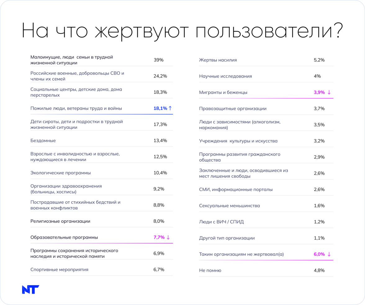 В фаворитах благотворителей — лечение детей, защита домашних животных и помощь малоимущим. Эти направления чаще всего поддерживают финансово.