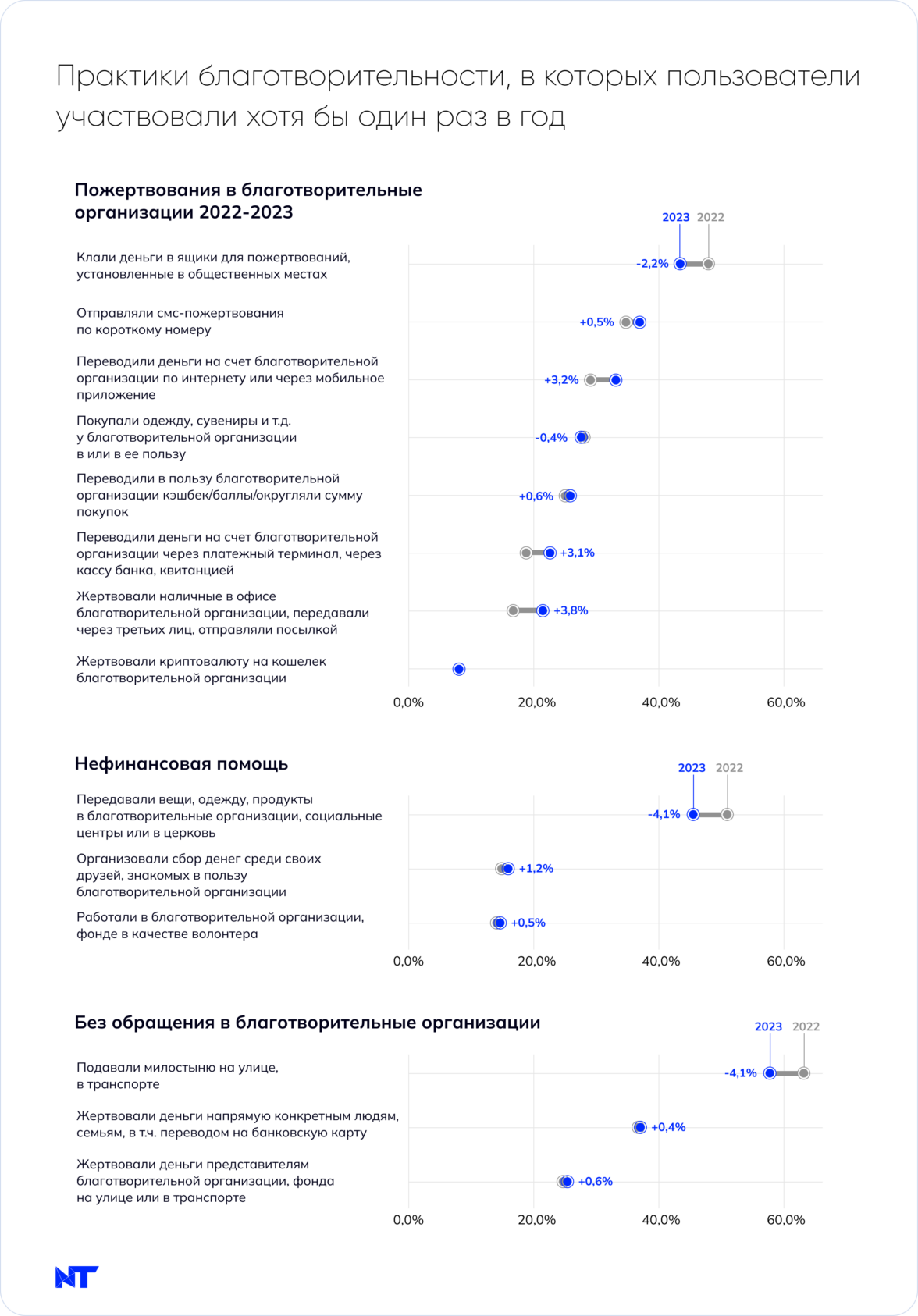 Чаще всего передают вещи, жертвуют деньги в ящики-копилки в общественных местах и отправляют смс на короткий номер. Из изменений за последний год — пользователи стали чаще жертвовать наличные фондам или переводить средства на счет.