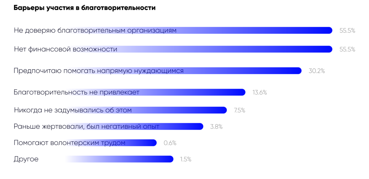 Главные причины почему люди не участвуют в благотворительности — недоверие к благотворительным фондам, финансовые трудности и желание помогать напрямую.