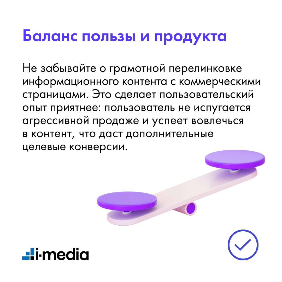 Не забывайте о грамотной перелинковке информационного контента с коммерческими страницами. Это сделает пользовательский опыт приятнее: пользователь не испугается агрессивной продаже и успеет вовлечься в контент, что даст дополнительные целевые конверсии.