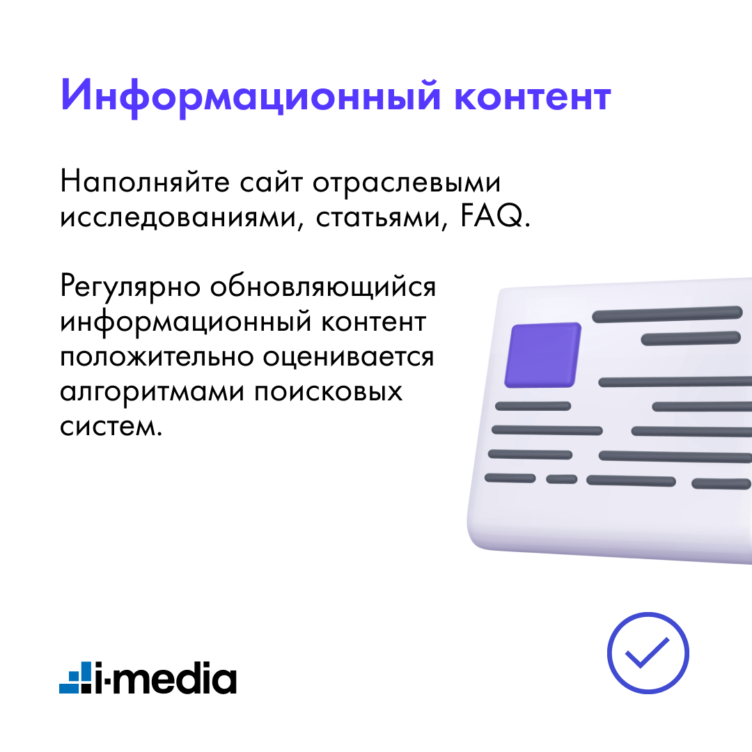 Наполняйте сайт отраслевыми исследованиями, статьями, FAQ. Регулярно обновляющийся информационный контент положительно оценивается алгоритмами поисковых систем.